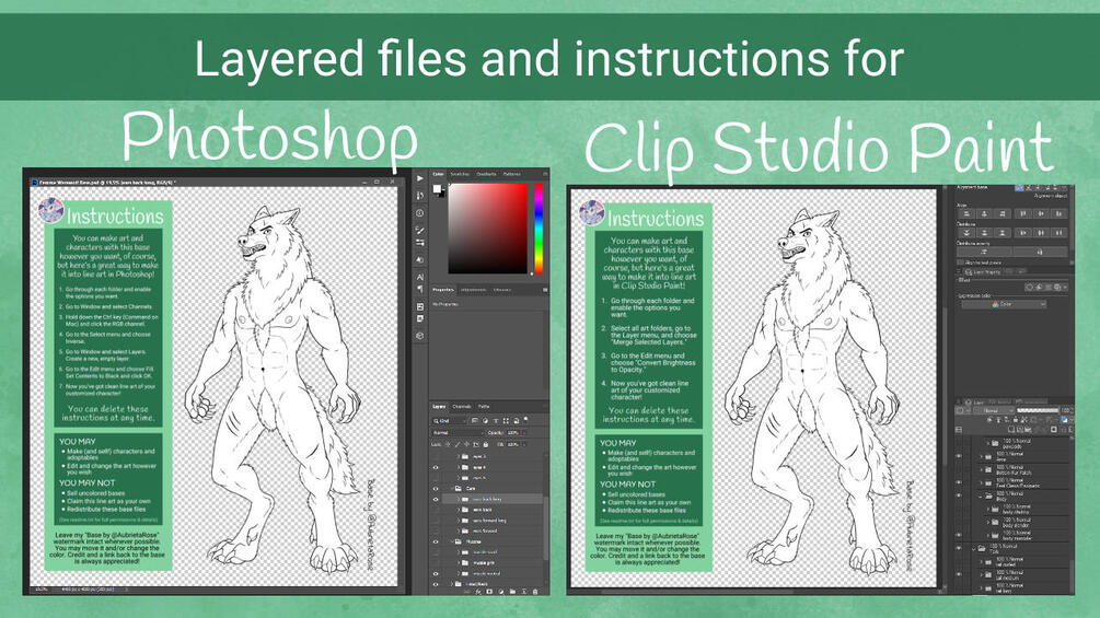 This base comes with a Photoshop PSD file and a Clip Studio Paint CLIP file, both layered, with line art separate from the white color fills. They each have instructions for how to convert your customized werewolf over to clean line art, or you can separate out and use the existing white fill so the flat coloring is already done for you. It's up to you!