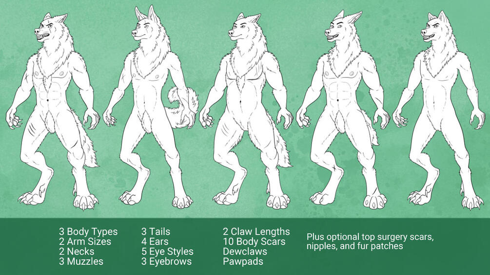 A male werewolf line art base with 63 interchangeable pieces for creating characters and adopts.